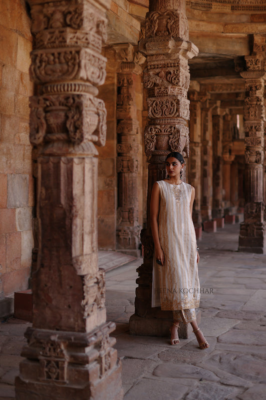 INNER KURTA: Cream Tissue Lines Chanderi Kurta (sleeveless) CAPE: Cream Chanderi Cape SALWAAR: Cream Chanderi Salwaar EMBROIDERY: Gota NO. OF COMPONENTS: 3pc- From Rs. 55,200.00