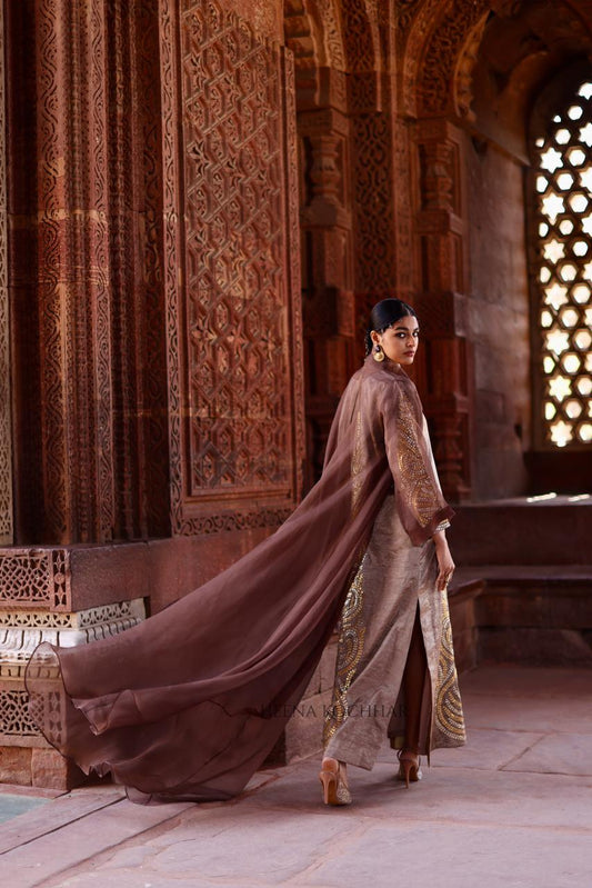 KURTA: Pure Antique Tissue Kurta EMBROIDERY: Gota NO. OF COMPONENTS: 1 pc (cape not included)- From Rs. 43,500.00