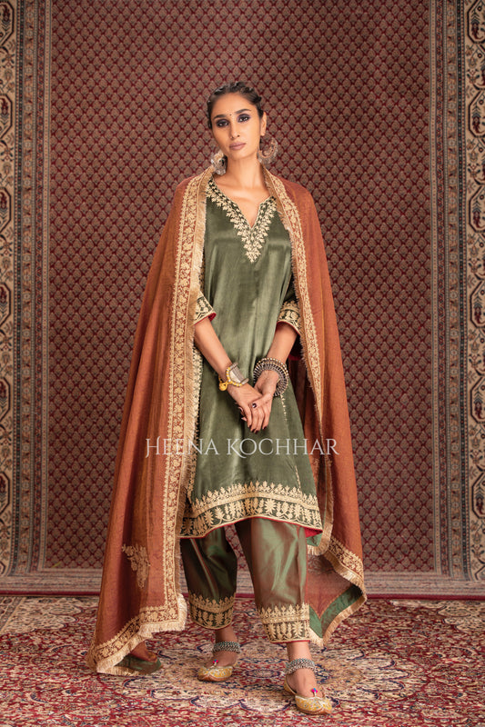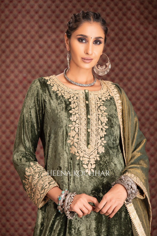 KURTA: Green Velvet Kurta BOTTOM TYPE: Green Velvet Salwaar ODHANI: Tissue EMBROIDERY: Zari Dori Embroidery- From Rs. 64,700.00