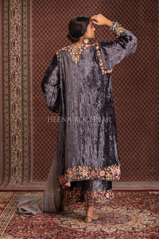 KURTA: Grey Velvet Kurta BOTTOM TYPE: Grey Velvet Farshi ODHANI: Grey Tissue EMBROIDERY: Multicolor Thread Embroidery- From Rs. 61,500.00