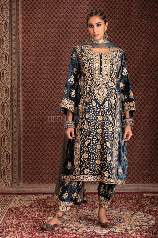 KURTA: Teal Velvet Choga BOTTOM TYPE: Teal Velvet Salwaar EMBROIDERY: Zari Ari Embroidery- From Rs. 61,500.00