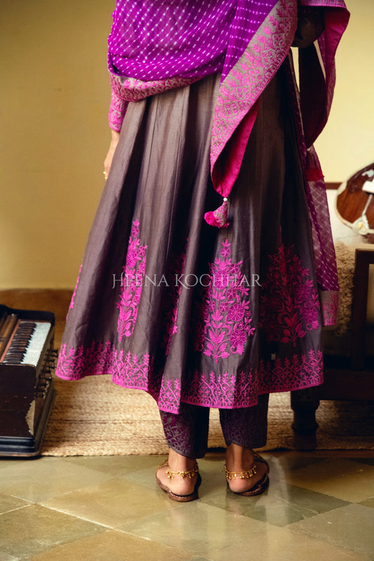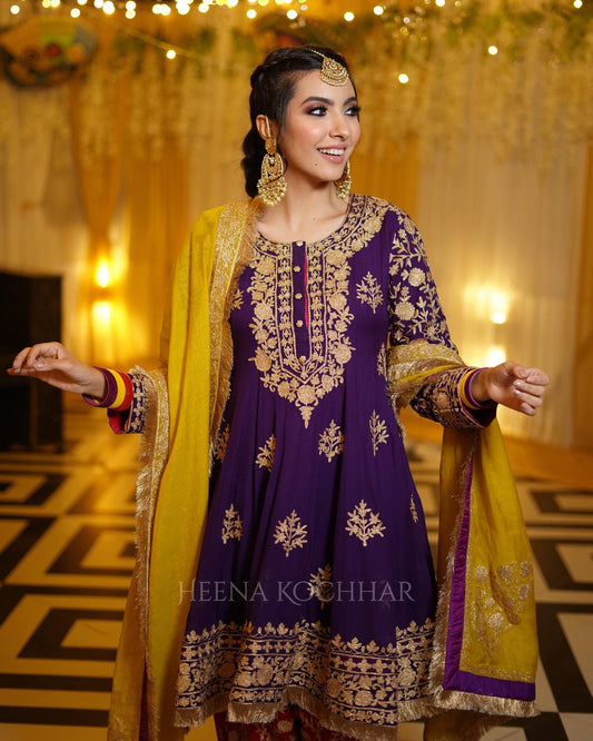 COLOR: King Purple With Rani KURTA: Georgette Short Kali Kurta | Length: 32€š¬³ BOTTOM TYPE: Silk Salwaar | Length: 38€š¬³ ODHANI: Lehriya Georgette EMBROIDERY: Zari Ari Embroidery- From Rs. 59,400.00