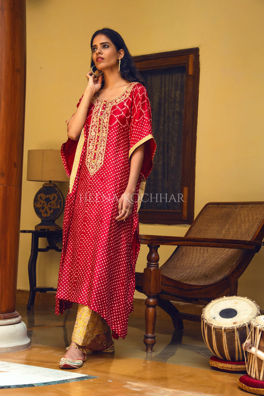 COLOR: Red With Yellow Bandhani KAFTAN: Silk | Length: 46€š¬³ BOTTOM TYPE: Chanderi Salwaar | Length: 38€š¬³ EMBROIDERY: Zari Sitara Embroidery- Rs. 59,400.00