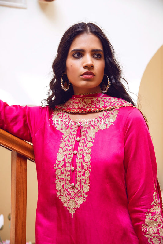 COLOR: Redish Rani KURTA: GEORGETTE | Length: 50€š¬³ BOTTOM TYPE: Chanderi Sharara | Length: 40€š¬³ EMBROIDERY: Zari Embroidery- From Rs. 72,100.00