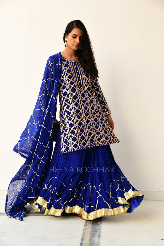 COLOR: Ink Blue KURTA: Georgette | Length: 35€š¬³ BOTTOM TYPE: Georgette Crush Skirt | Length: 40€š¬³ ODHANI: Georgette Crush EMBROIDERY: Gota Embroidery- From Rs. 72,100.00