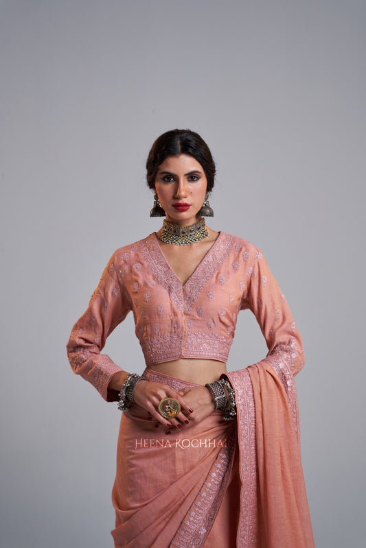 SAREE: Peach Tissue Saree Blouse: Peach Tissue (Unstitched) EMBROIDERY: Zari Dori NO. OF COMPONENTS: 2 pc- Rs. 59,400.00