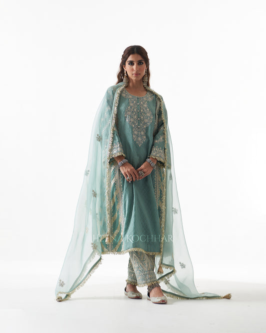KURTA: Sap Green Benarsi Choga BOTTOM: Sap Green Chanderi Salwaar ODHANI: Sap Green Georgette Odhani EMBROIDERY: Zari Ari NO. OF COMPONENTS: 3pc- From Rs. 52,000.00