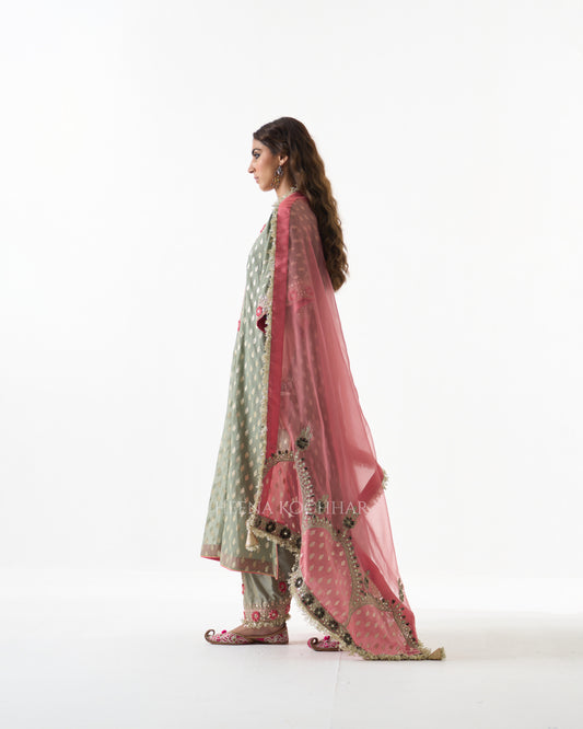 KURTA: Sap Green Benarsi Chanderi Choga BOTTOM: Sap Green Chanderi Salwaar ODHANI: Rose Pink Organza Odhani EMBROIDERY: Resham Dori Sitara NO. OF COMPONENTS: 3pc- From Rs. 49,900.00