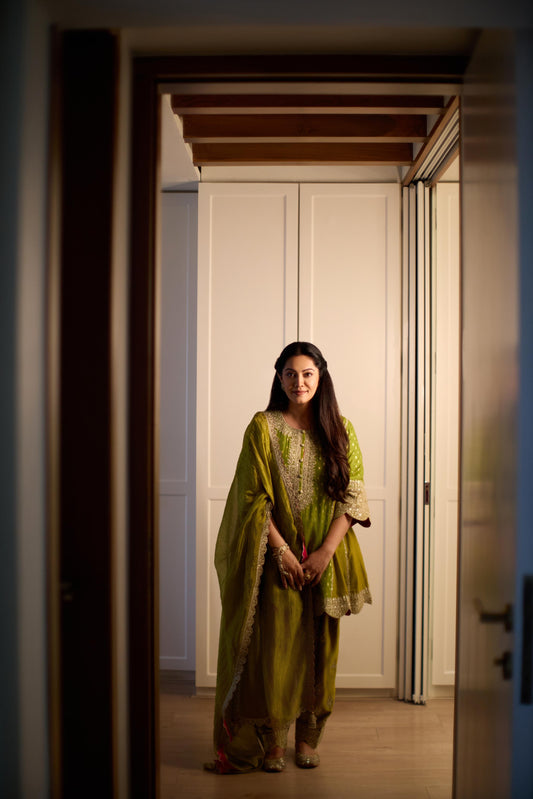 KURTA - Parrot Green Georgette Anarkali BOTTOM -Parrot Green Linen Silk Salwar ODHANI - Parrot Green Organza EMBROIDERY - Gota Ari NO. OF COMPONENT- 3 Pcs- From Rs. 52,000.00