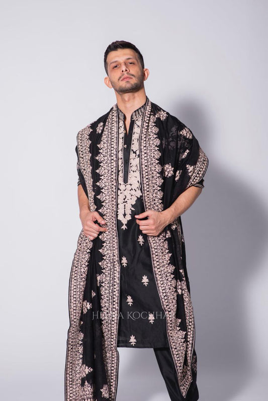 KURTA: Black Benarsi Choga BOTTOM: Black Silk Salwaar ODHANI: Black Organza Odhani EMBROIDERY: Zari Ari Sitara NO. OF COMPONENTS: 3pc- From Rs. 64,700.00
