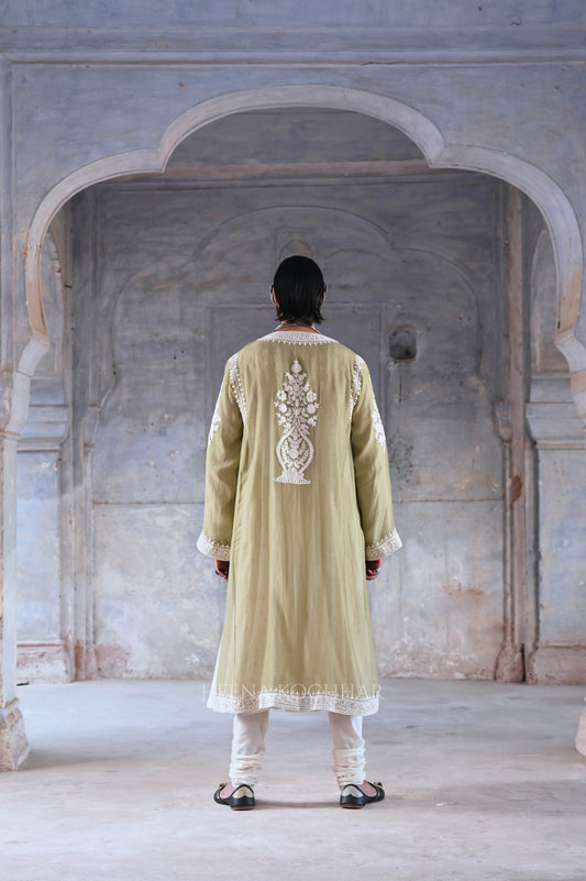 KURTA - Mehendi Green Banarsi Georgette ChogaBOTTOM- Mehendi Green Silk Linen Faata Pajama ODHANI -N/AEMBROIDERY - Gota AriNO OF COMPONENT - 2 Pcs- From Rs. 40,300.00